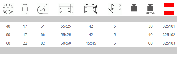 Recomendadas para usos en carros de hostelería y de colectividades con cargas ligeras Buena resistencia a los agresivos químicos, no aptas para pavimentaciones irregulares. Ejemplo de aplicaciones recomendadas: expositores para comercios, carros para hostelería, muebles con cargas ligeras.