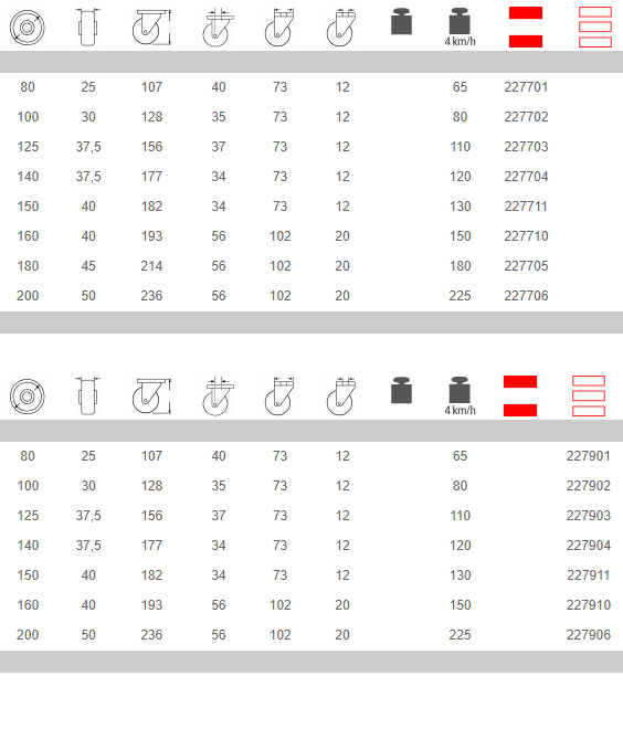 Indicadas para carros de cargas ligeras, incluso en presencia de obstáculos, y para usos mixtos internos-externos. El bandaje de goma gris anti-huella las convierte en aptas para uso con pavimentación frágil y en ambientes domésticos/colectividades. Ejemplo de aplicaciones recomendadas: carros portaequipajes, carros portautensilios, pequeños andamios móviles, contenedores de basura.